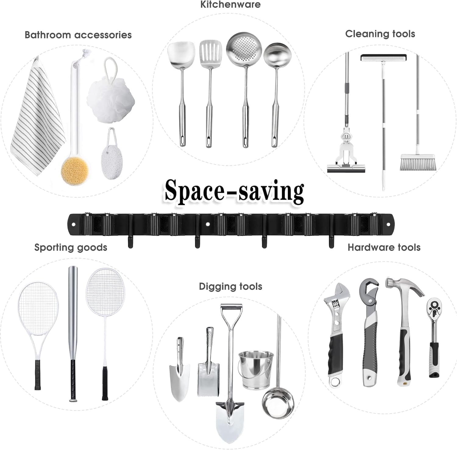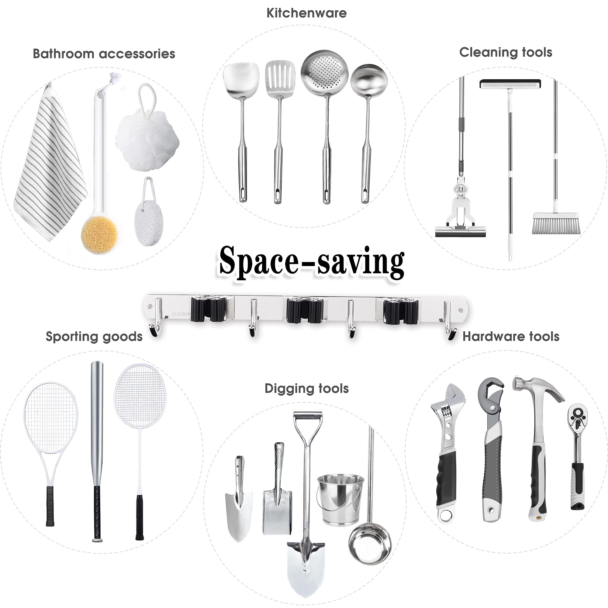 [Wide applications]-The broom storage organizer is designed to hold various household objects to save space and decorate. It’s large enough to hang your brooms, mops, racks, rags, brushes, gloves, baseball bats and so on. Suitable for kitchen, bathroom, garage, laundry, broom closet, washing storage and even works outdoors or in the shed for your garden tools!