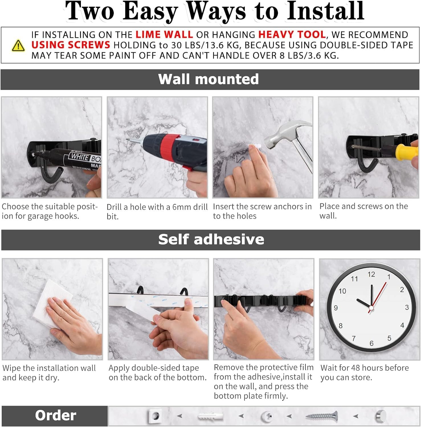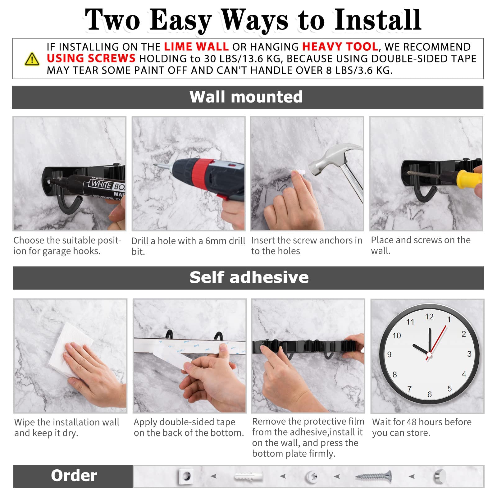 [Easy installation]-Two ways to install the mop holder within minutes designed for different installation surfaces. Broom holder wall mount self adhesive for smooth surfaces, screw drilling wall mounted for rough surfaces. (For weighty or outdoor hanging, screw drilling is recommended)