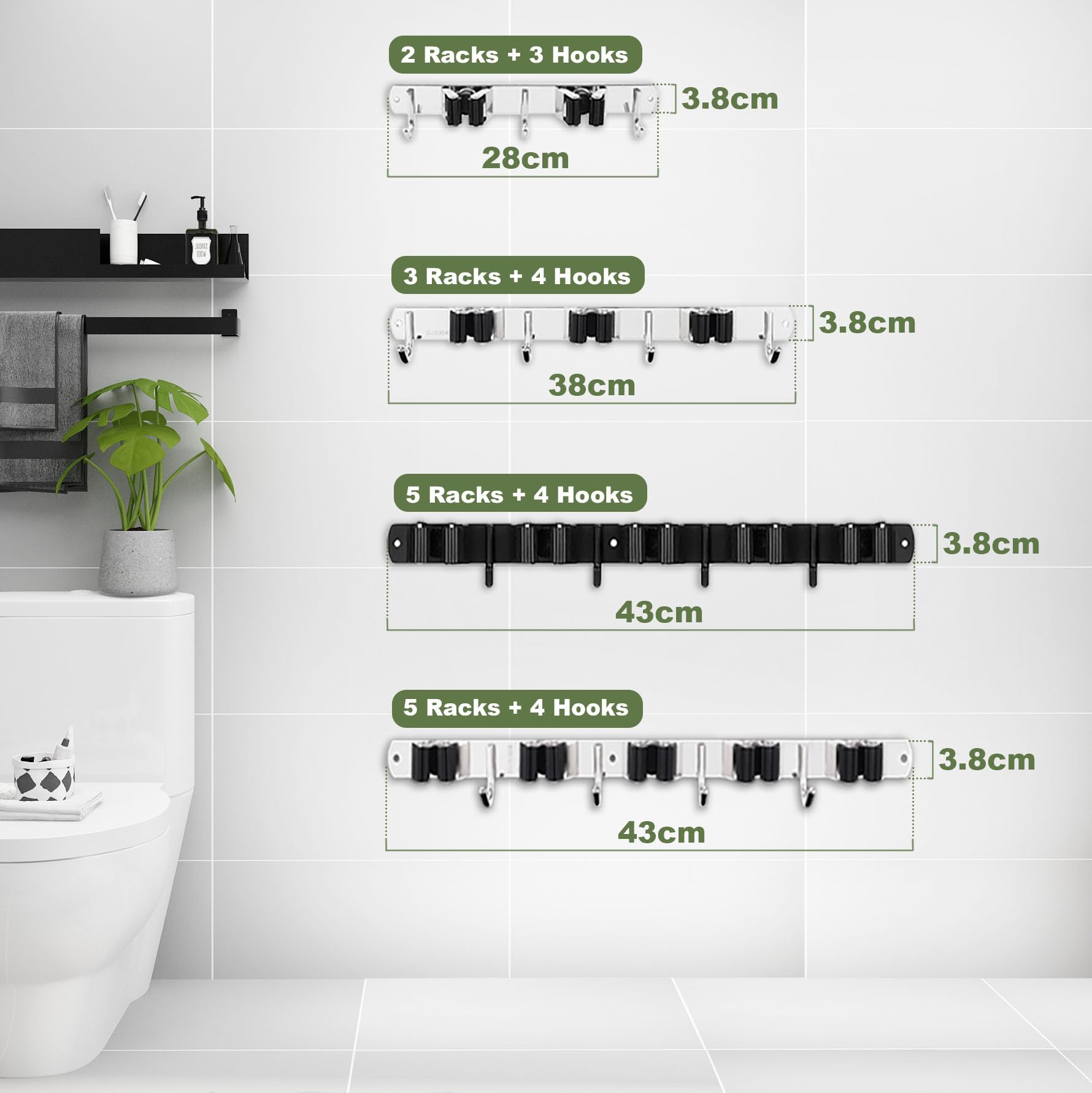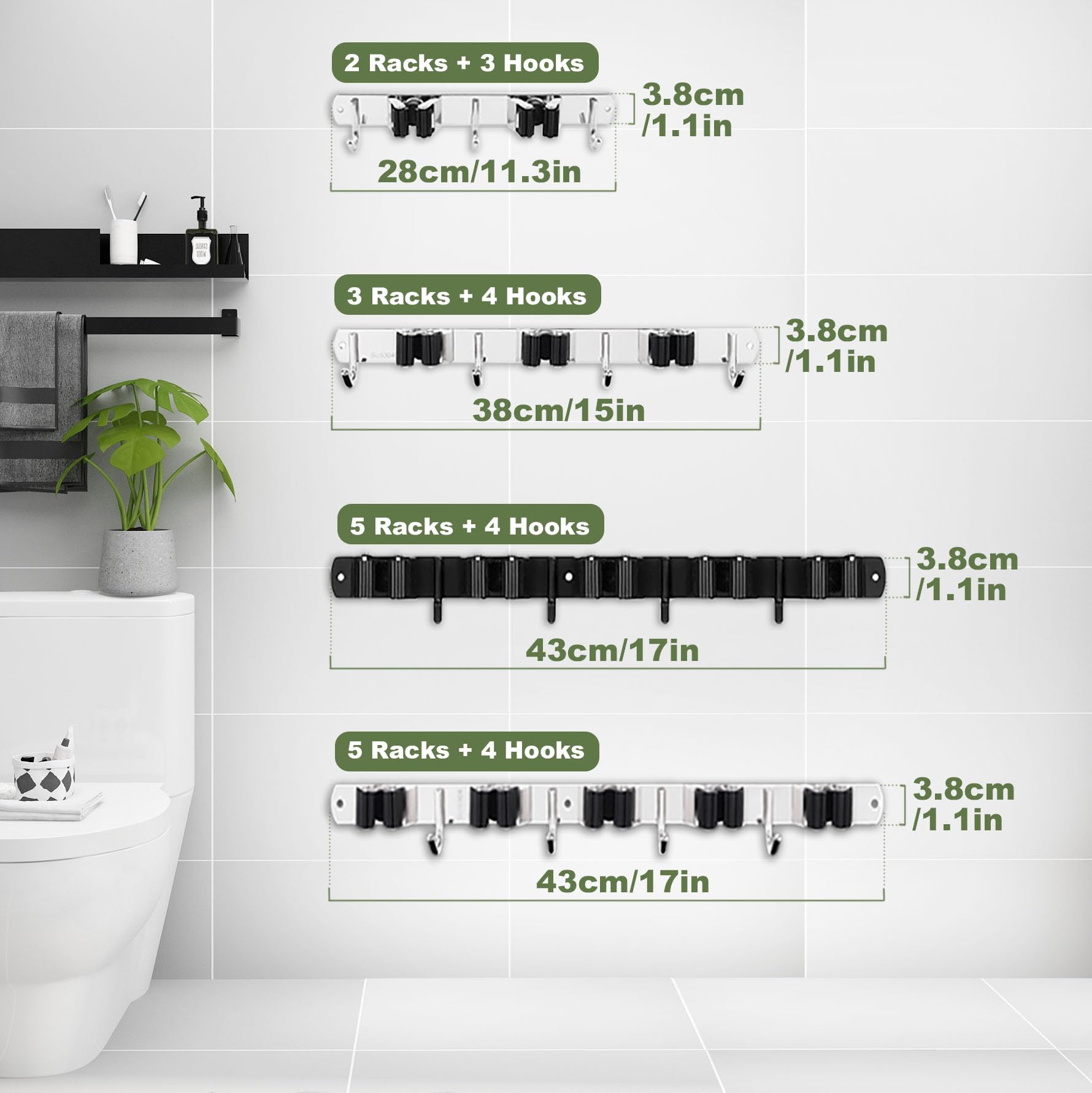 The upgrade mop and broom holder features a sturdy structure and high quality material to hold any things easily like mops, clothes, towels, keys and more.