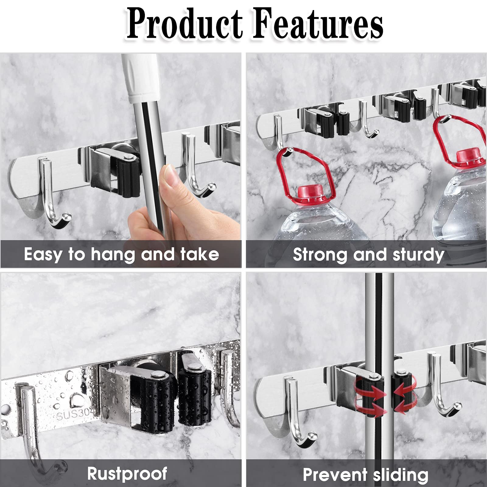 [Strongest Hold & Non-slip Design]-The broom and mop holder wall mount is made of rustproof 304 stainless steel, more durable than plastic materials, holds items up to 30 lbs when secured with screws (or 8 lbs if secured with self-adhesive). The broom hanger combines with anti-skid silicone, preventing scratches, slots are double rubber gripped to help keep a stronger hold on your items.